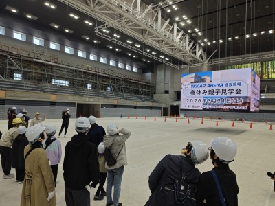 3月21日(土)に建設現場を間近でご覧いただく「YKK AP ARENA建設現場 春休み親子見学会」を開催し、富山市在住の親子約90名の皆さまにご参加いただきました。
